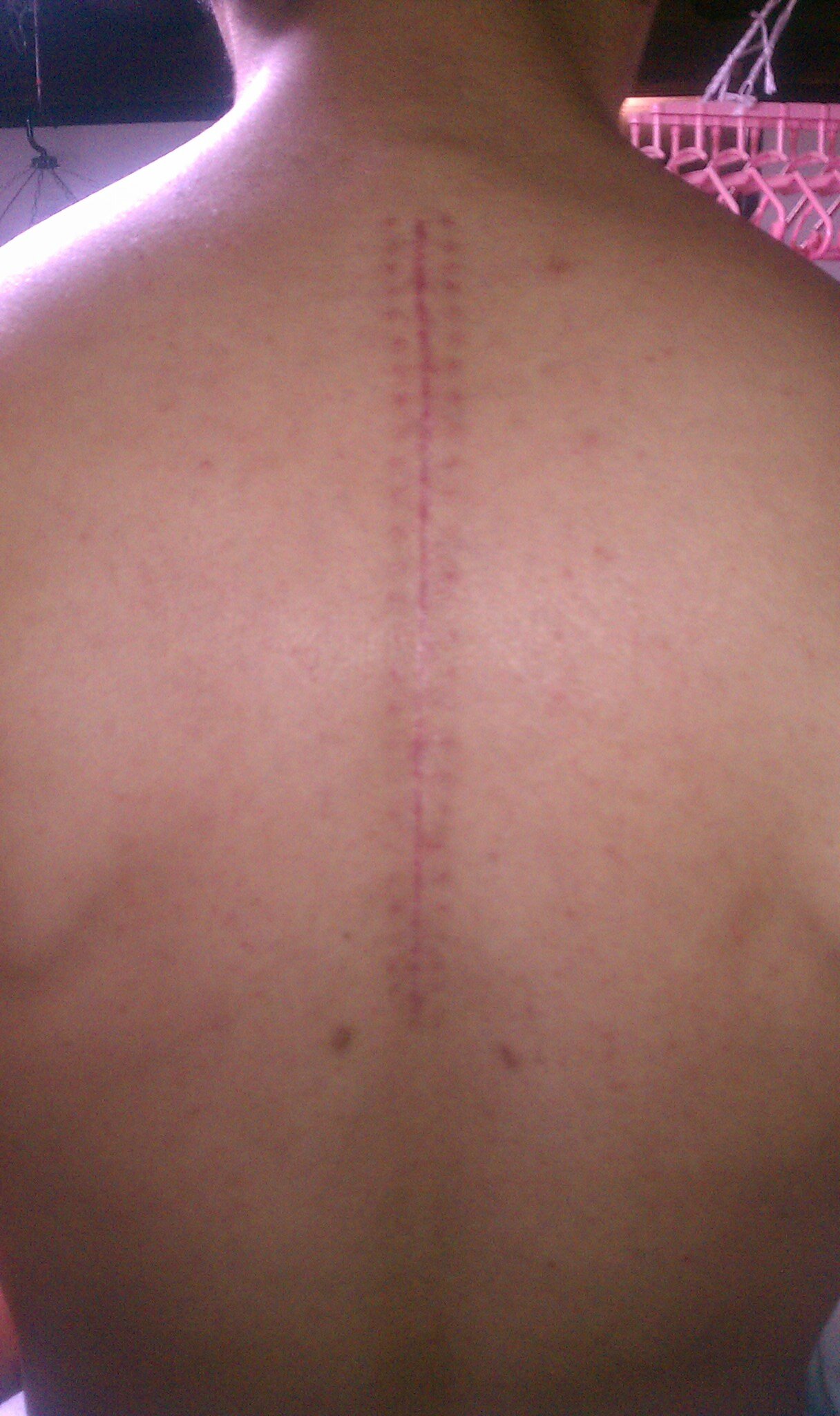 そもそも原因がイマイチ分からないのが困ったところです。恐らく手術が原因だと思いますが、それだとゆっくり背中の傷が癒えるのを待つしかできません。